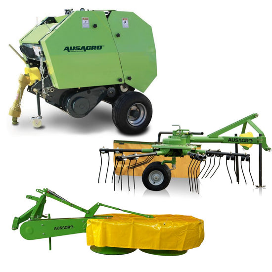 El Combo Aus Agro para realizar fardos es la solución definitiva para pequeños agricultores y aficionados que buscan optimizar su proceso de henificación. Este paquete todo en uno incluye todo lo necesario para cortar, rastrillar y empacar el heno eficientemente, ahorrándole tiempo y esfuerzo.Perfectamente adaptado a tractores compactos, este paquete le garantiza producir heno de alta calidad con mínimas complicaciones, ¡a la vez que reduce su dependencia de terceros. Tanto si busca mejorar su productividad o para tener fuente adicional de ingresos, este paquete es su aliado ideal